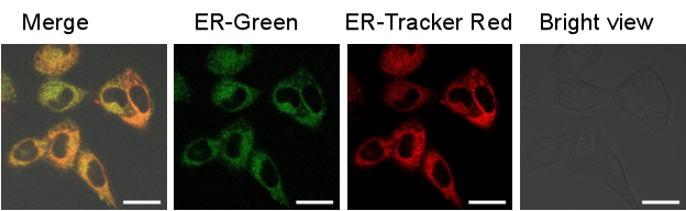 ER-Green是生光生物科技公司通過對對文獻報道內質網探針進行結構修飾與優(yōu)化,篩選得到的一類高選擇性內質網定位綠色熒光探針。ER-Green可以用于活細胞內質網特異性熒光染色。與商業(yè)化 ER-Tracker Red 等探針相比,ER-Green熒光強度強,細胞毒性低,光穩(wěn)定性強。ER-Green在活細胞內持續(xù)時間長,可以和其它探針實現聯(lián)合使用。